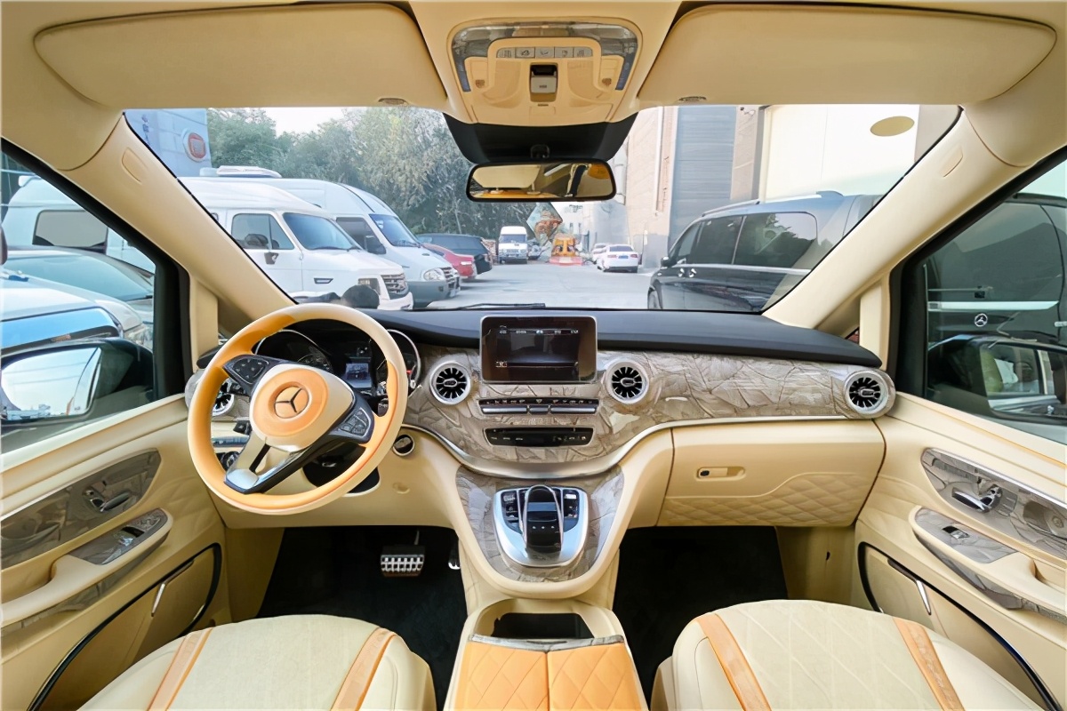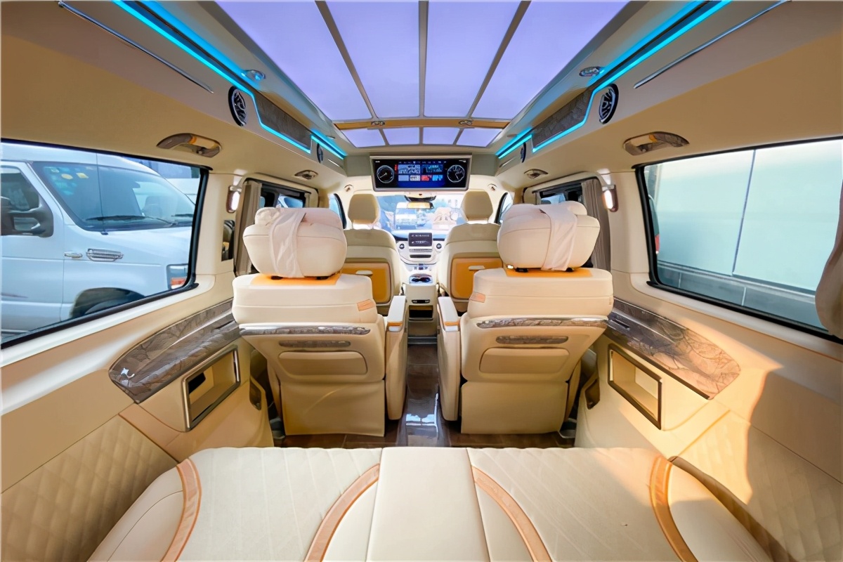全新奔驰V260升级版内饰基本向上S级高端商务轿跑看齐,中控台的豪华程度及其完善的多媒体配置都保持着奔驰品质一贯的高规格,8.4寸电控触摸屏,一体式木纹饰板,整个驾驶舱看上去格外合乎现代科技感审美标准,多功能方向盘,配备蓝牙电话、定速巡航、换挡拨片等一套丰富的驾控体验。奔驰V260改装商务房车贵宾舱全景。