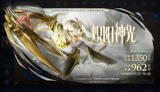 本周五0点,暖阳的总决赛FMVP皮肤:镜「炽阳神光」正式上线!皮肤售价1688点券,首周(1.22~1.28)限时折扣1350点券;首周还有专属活动「炽阳神光」限时388点券抵用券,所以最终皮肤的价格只要962点券,一下子省了700多点券,想入手皮肤的玩家不要错过首周的活动。