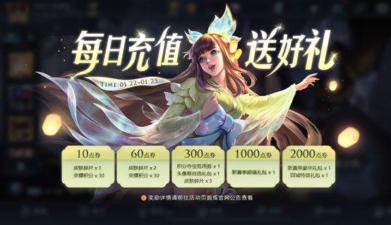 现在的每日充值活动根本停不下来!新年快到了,王者荣耀将会在未来一个多月的时间疯狂上线超多皮肤。所以官方基本每周都会推出每日充值活动,大家可以借这个机会多攒一些点券,白嫖一些皮肤碎片等好礼。
