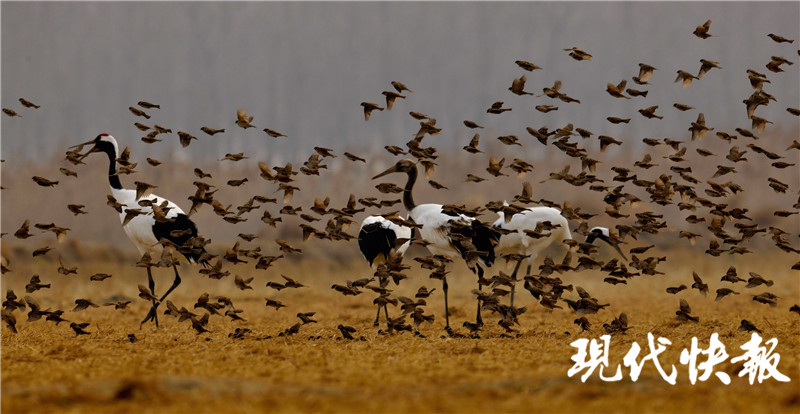 “滩涂中拥有丰富的植物、鱼类与底栖生物,可为不同食性的鸟类提供食物保障。前段时间受冷空气影响,滩涂水面结冰,形成丹顶鹤及其它鸟类大集群,场面蔚为壮观。”盐城国家级珍禽自然保护区相关负责人说。