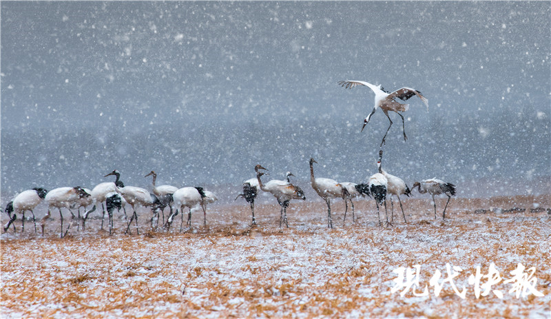 现代快报讯(通讯员 孙榕见 记者 王菲)今年,盐城黄海湿地像往年一样,迎来大批候鸟在此越冬。其中,丹顶鹤的身影尤为引人注目。它们在天水之间,灵动地伸展着洁白的羽翼,或飞行、或觅食、或玩耍,给寂寥的冬日增添了些许亮色。