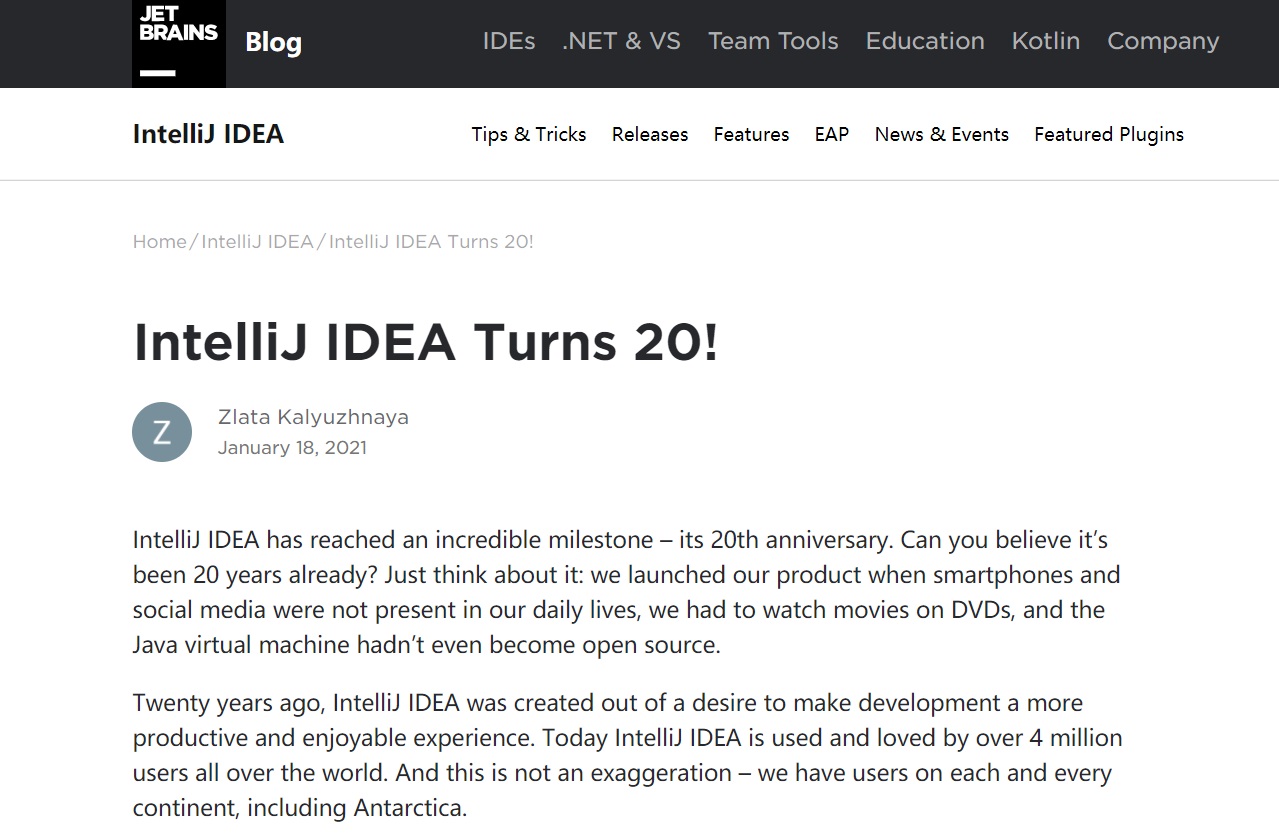 IT之家1月20日消息 1 月 18 日,JetBrains 软件公司在官方论坛发布公告,庆祝旗下著名 Java 开发工具 IntelliJ IDEA 发布 20 周年。