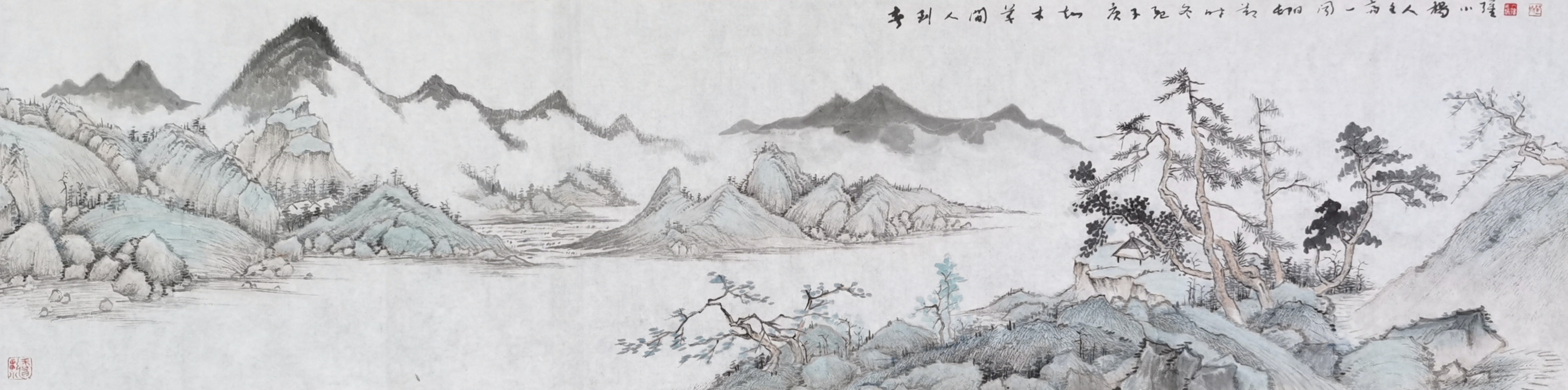 中国山水画是点与线的舞蹈,是笔与墨的水晕墨章。杨小强深厚的书法家学功底,为他的中国山水画创作打下了坚实的地基。杨小强山水画的启蒙老师是汤文选、刘文湛和周少华三位先生,他的启蒙教材是胡佩衡先生的《怎样画山水》。在近现代山水画家中,杨小强推崇黄宾虹和李可染积墨法笔下形成的“浑厚华滋”的画风,如李可染《万山红遍》《万水千山图》和黄宾虹的后期山水画,他们那种平、远、流、重、变的五种笔法,就像武林盟主心手双暢的各种刀法,高深莫测,出神入化,又力透纸背气盖势!在古代山水画家中,杨小强从元四家大痴子黄公望《富春山居图》和王蒙《青卞隐居图》《夏山高逸图》《桃花渔艇图》中吸取丰富的艺术滋养,得“南宗”山水之要旨,外师造化(巫峡、西陵峡、天柱山、隔河岩、鱼峡口、武落钟离山),中得心源,以披麻皴、牛毛皴组合小斧劈皴法表现八百里清江画廊里秀润的千山万水,诗意的渔舟晚樵和浓得化不开的土家风情。古今山水滋养成就了杨小强入选全国美展的《晨光》《隔河岩》和《清江山水写生系列》!余借用清人戴熙《习苦斋画絮》所言点评杨小强笔下的鄂西山水画:“春山如美人,夏山如猛将,秋山如高人,冬山如老衲。各不相胜,各不相袭,大美无言,胜有形也。”