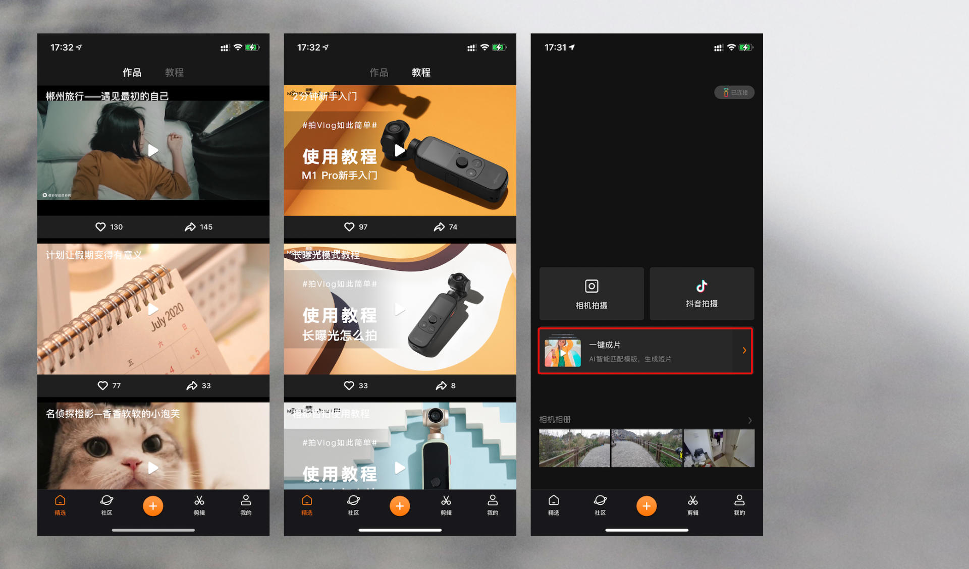 最早拿到橙影智能摄像机 旗舰版时,虽然我知道它与抖音有密切合作,但是不知道它到底能够实现哪些功能。实际上手以后我发现,在橙影App内,有一个抖音拍摄模式。在该模式下拍摄的画面,我们可以直接剪辑,一键跳转到抖音发表页面进行视频发布。