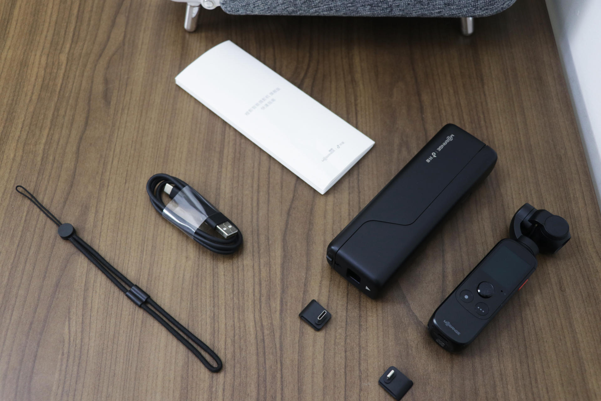 打开包装,移走盖板,橙影智能摄像机 旗舰版就会呈现在我们眼前,移开固定相机的隔板,下方就是相机的全部配件。除了橙影智能摄像机 旗舰版外,在包装中我们还能看到金属收纳盒、挂绳、USB Type C连接头,USB连接头,充电数据线,以及使用说明书。