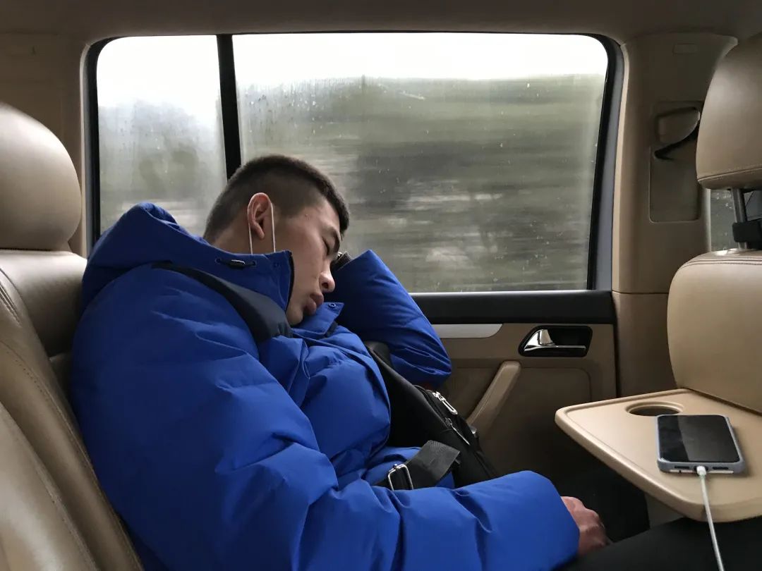 12月28日,韩全新去郑州和生父母见面,回济源的路上睡着了。新京报记者 张惠兰 摄