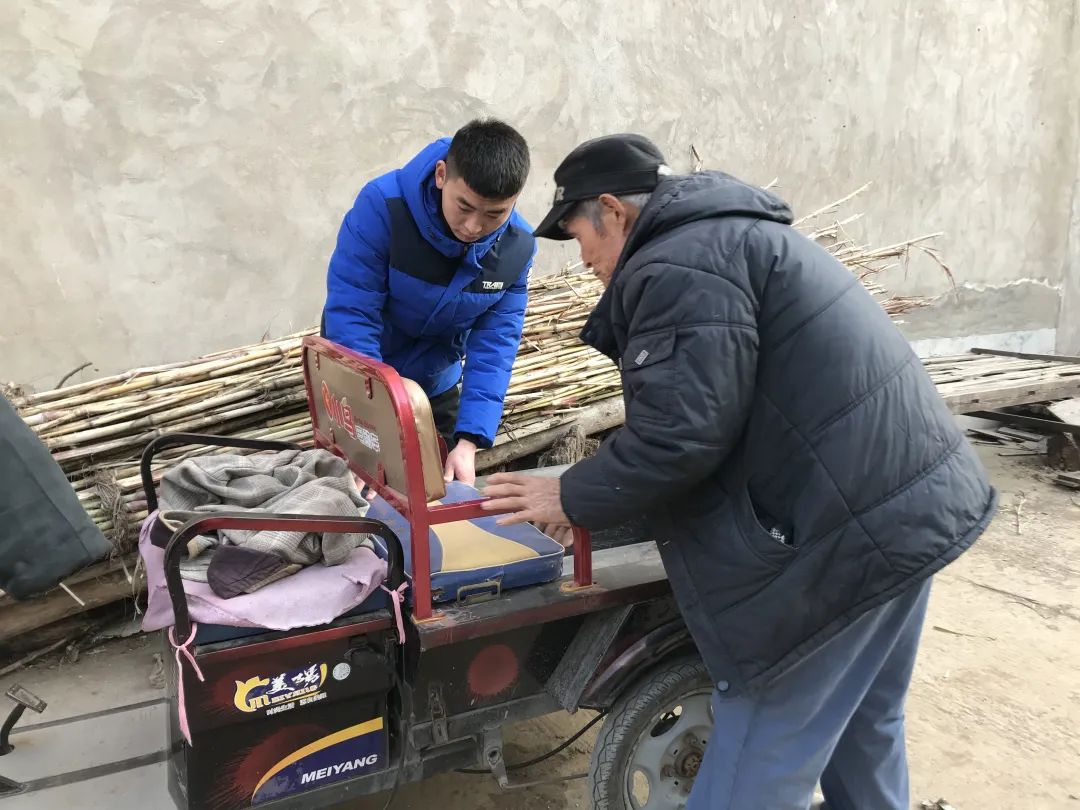 韩全新和爷爷韩升禄。这辆小三轮,就是当年赵小兰载全新上学的车子。新京报记者 张惠兰 摄