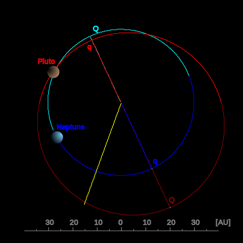图解:从极面看冥王星轨道。此视角显示冥王星的轨道(红色)比海王星轨道(蓝色)离心率更高、冥王星有时比海王星更靠近太阳。深色部分表示该段轨道穿过黄道面进入黄道下方。