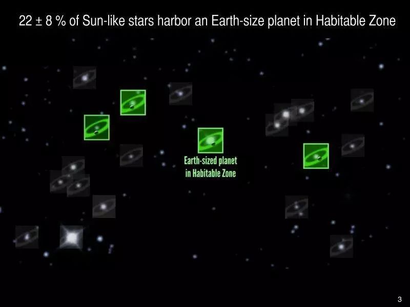 图解:通过对开普勒太空望远镜四年来的精确测量数据进行分析,发现有22±8%类日恒星的宜居带中拥有地球大小的行星。如果这些行星能像在开普勒望远镜视野里一样的普遍的话,那么我们到最近的一颗类地宜居行星的距离大约是12光年。资料来源: 佩提古拉/加州大学伯克利分校,霍华德/夏威夷大学马诺阿分校,玛西/加州大学伯克利分校。