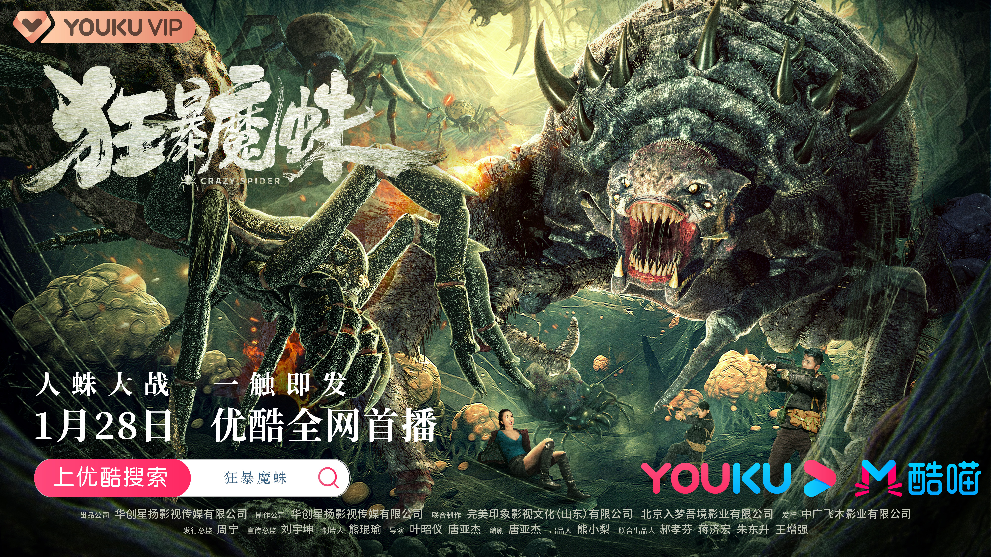 暨动作冒险怪兽片《大蛇2》后,重磅人蛛大战动作片《狂爆魔蛛》将于1月28日在优酷正式上线播出!该片由华创星扬影视传媒、北京入梦吾境影业有限公司出品,中广飞木影业宣传发行,《大蛇》系列电影创造网络票房5000万冠军,吞天巨兽《狂暴魔蛛》希望突围2021创造新的票房奇迹,也为优酷怪兽宇宙厂牌新增一块坚定的基石。