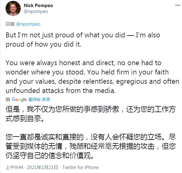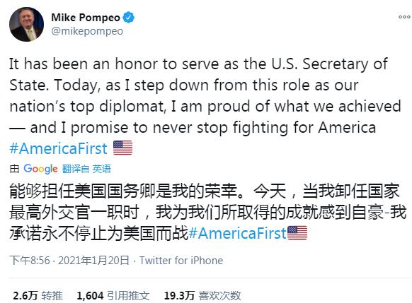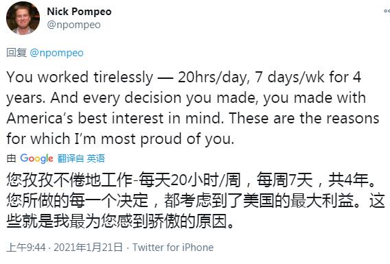 这个人不会就此告别政坛,他在特朗普离任的最后时间点,还在卯足了劲在表功,说“当我卸任国家最高外交官一职时,我为我们所取得的成就感到自豪,我承诺永不停止为美国而战”。