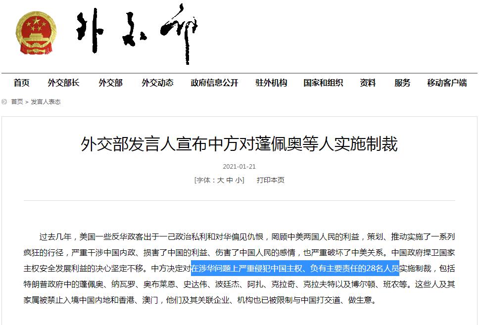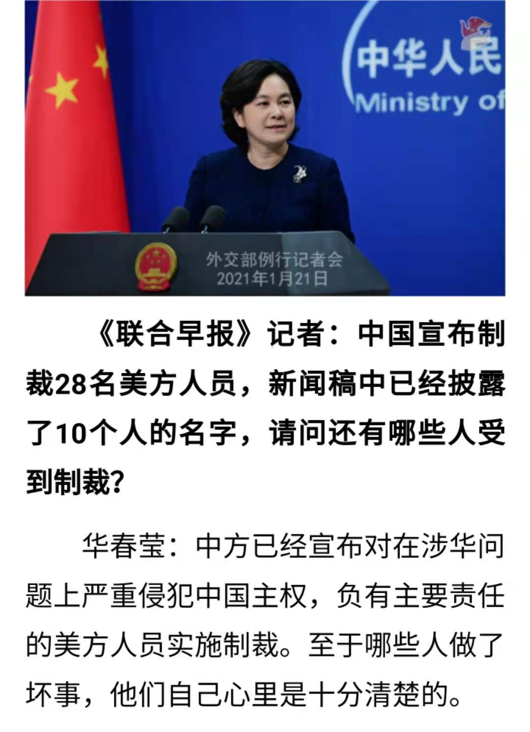 就在就职、总统权力交接时刻,中国外交部发言人宣布,中方对蓬佩奥等人实施制裁。