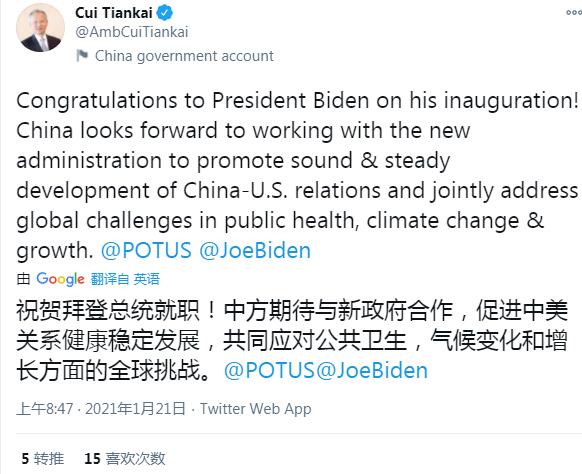 中国驻美国大使崔天凯也发了推文,祝贺拜登就职,期待与新政府合作,促进中美关系健康稳定发展,共同应对公共卫生,气候变化和增长方面的全球挑战。