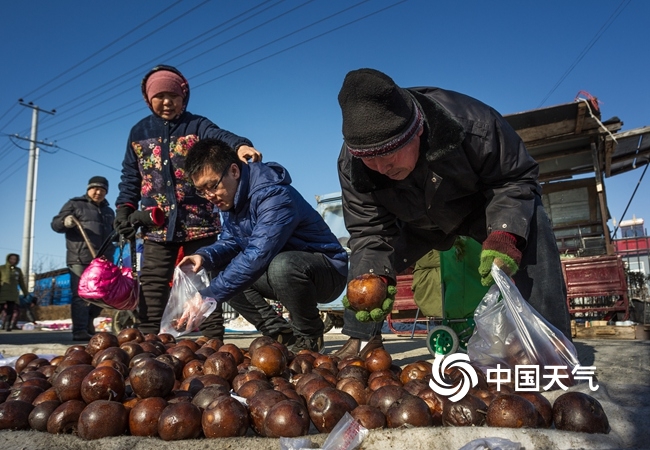 临近春节,黑龙江佳木斯采买年货的人们正在挑选冻梨。(肖殿昌/视觉中国)