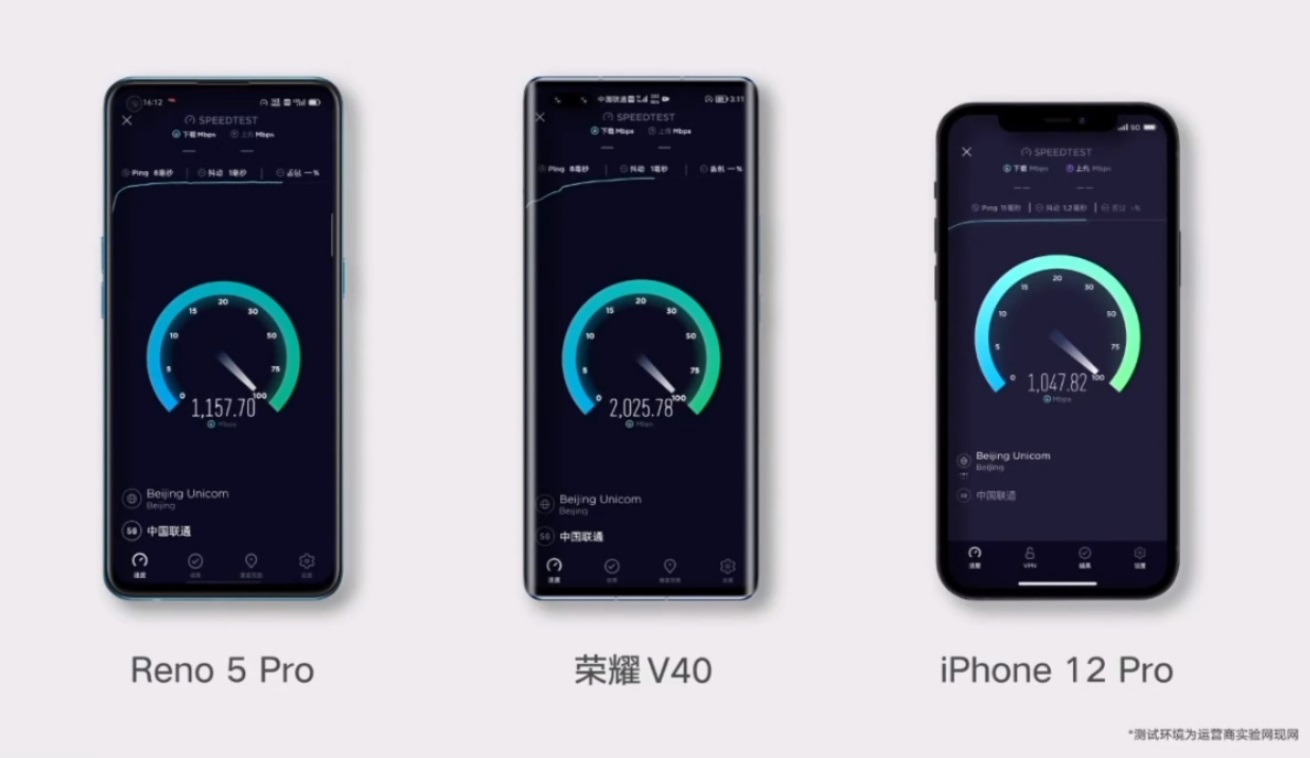 在发布会上,荣耀展现了荣耀 V40 与另外两款友商手机的实测对比。测试使用 SPEED TEST 软件,使用中国联通 5G 网络进行下载速度测试。