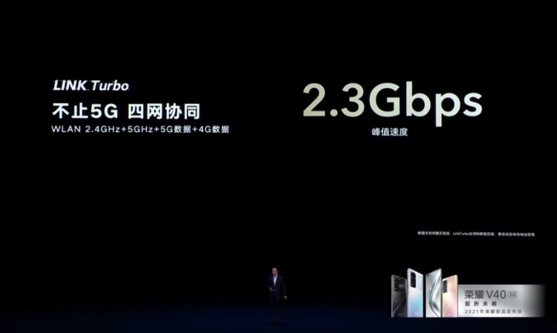 IT之家了解到,这款手机的 Link Turbo 技术还能实现四网协同,支持 2.4GHz+5GHz WLAN、5G 数据、4G 数据四种网络协同加速,峰值速度可达 2.3Gbps。这项功能可以自动开启,根据发布会的实测结果,荣耀 V40 在网盘下载、在线视频、在线游戏的实测应用中,均能实现流畅的网络体验。