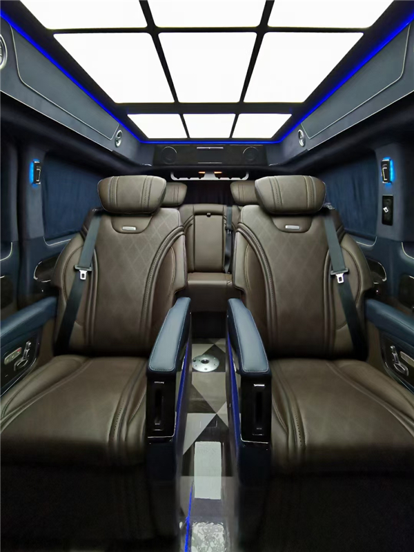 奔驰威霆改装后采用高顶半隔断设计,中间搭配液晶导航大屏幕 后舱太用上半隔断液晶电视 以及真皮包裹的多功能方向盘支持前后及高低角度调节,更集成了多项实用性功能操控,便捷随心。配合全新奔驰V级装载的代表国际顶尖水准的柏林之声音响系统,为车内营造有如身临其境一般的环绕立体声,给驾乘者带来更高音质的听觉体验。