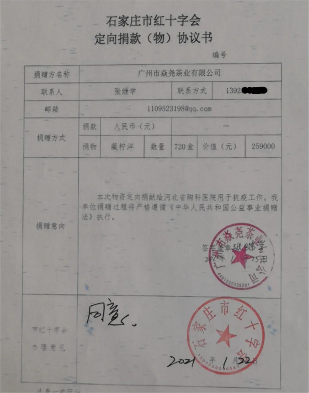 2021年1月22日上午,在焱尧藏茶营销总部,焱尧藏茶总经理张继学先生(以下简称张总)代表公司,将720盒价值25.9万元的“藏柠洋”藏茶,通过石家庄红十字会,定向捐赠给“河北省胸科医院”,向奋战在防疫抗疫一线的工作者表达敬意,助力河北人民抗击疫情、共度时艰。