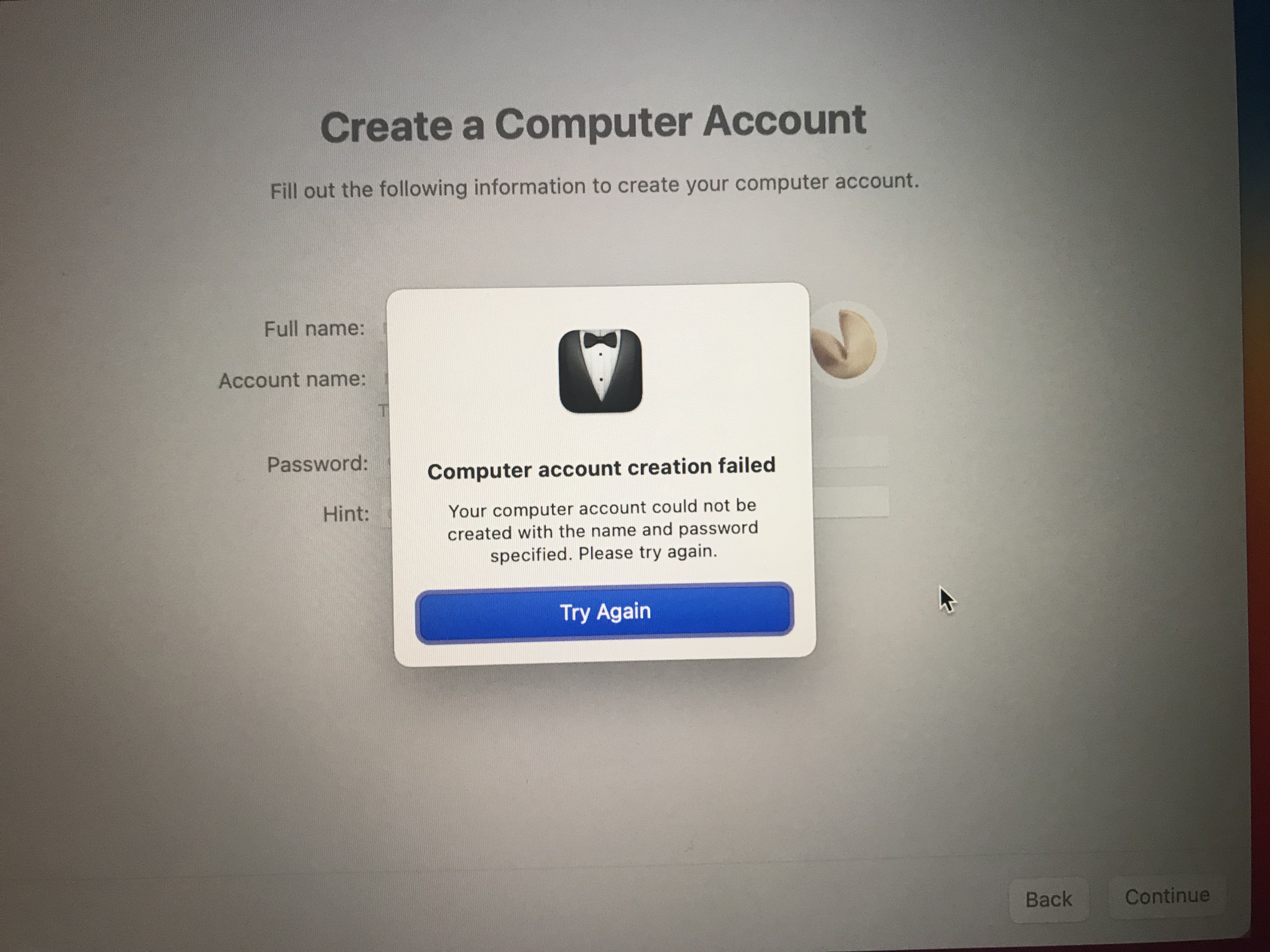在通过恢复模式抹掉磁盘并联网重装 macOS Big Sur 之后,我的 Mac 在系统初始化过程中卡在了创建用户步骤,系统在长时间无响应之后弹窗告知创建用户失败;重启 Mac 之后可以进入用户登录界面,但是无法通过初始化时设置的密码进行登录。