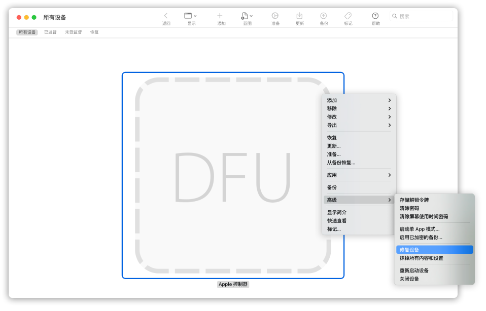 需要注意的是,与 iPhone 一样,Mac 进入 DFU 模式之后屏幕不会显示任何内容,Apple Configurator 中出现了显示「DFU」的设备占位图标之后即代表成功。