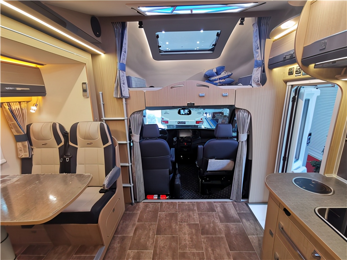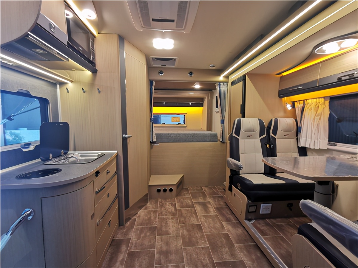 瑞弗V820采用了双拓展设计形式,因此内部空间尤其显得宽敞。车内采用E0级环保标准房车家具板材,温馨的内饰配色更贴合年长用户的喜好。驾驶室顶部一张双人床,车尾是一张可拓展的双人床,中部乘用车卡座,大厨房和宽敞的卫生间在车身的右侧部分。