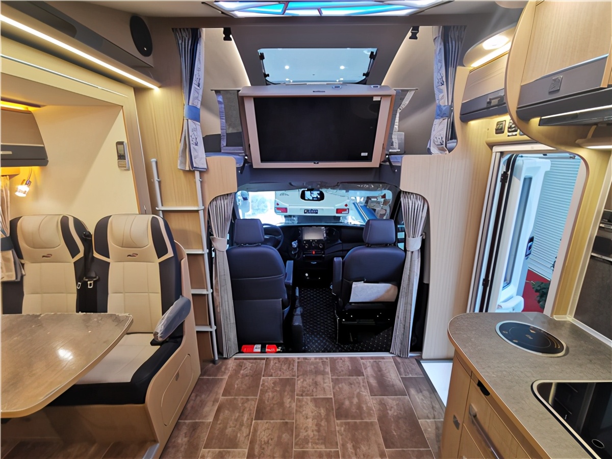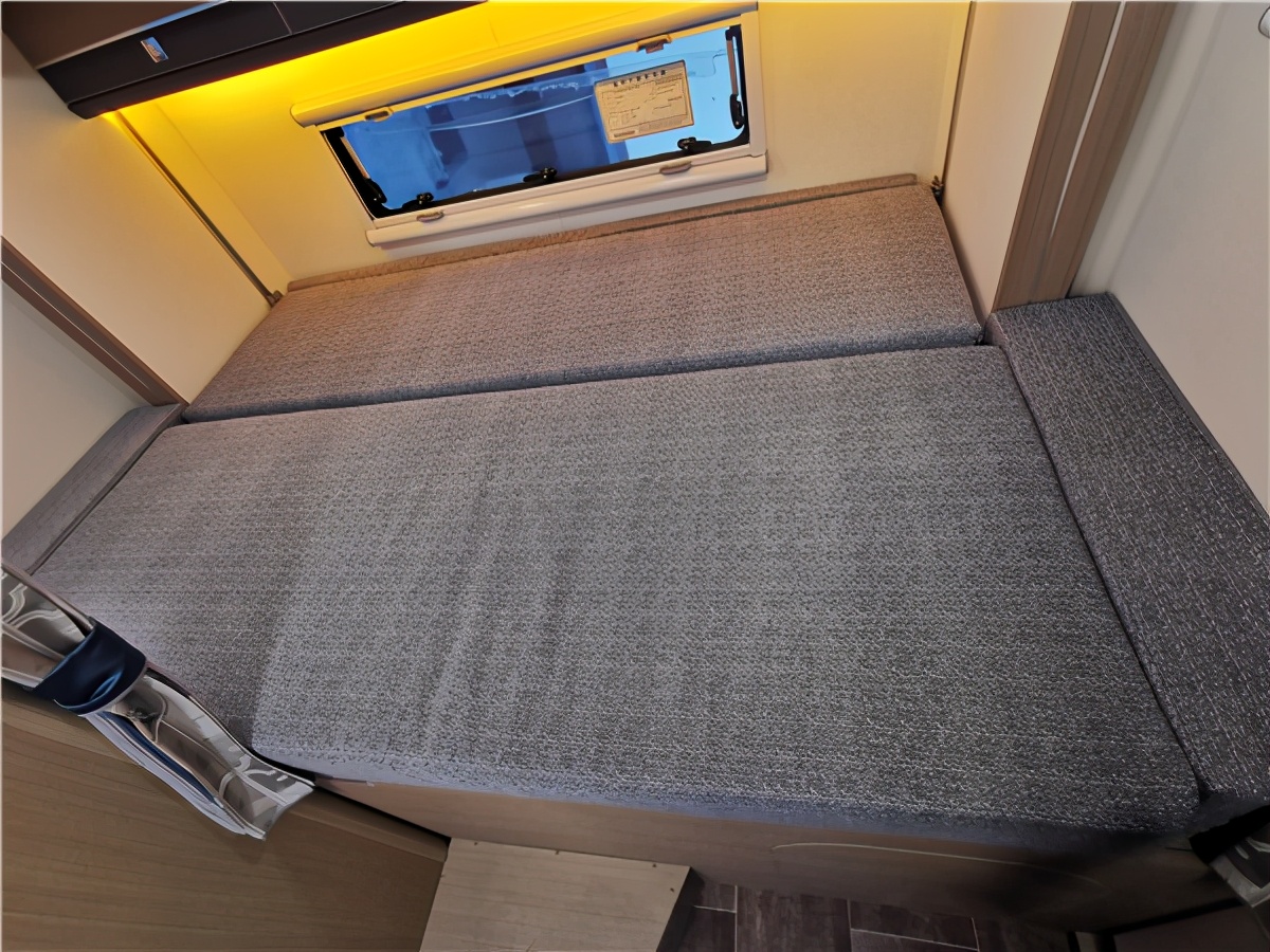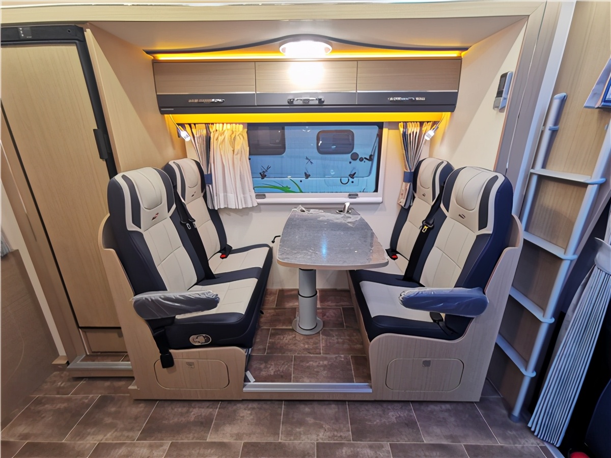 四座沙发座椅搭配可升降餐桌,座椅后面镶嵌进口152L大容量冰箱,如果床位不够睡可以把这个区域也拼成一张床。会客区和尾床都是可以拓展出去,所以这款V820是空间最大的,喜欢大空间的朋友选择这一款准没错!
