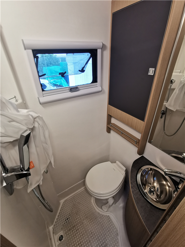 卫生间内部空间变现不错,内部包含独立淋浴系统、不锈钢水盆、角柜、多美达座便器和大量的储物格。水路系统标配200升净水箱、50升灰水箱和50升黑水箱。
