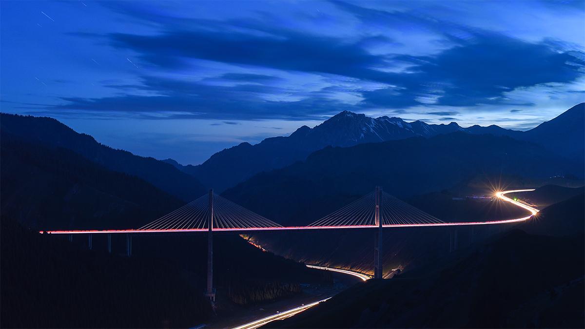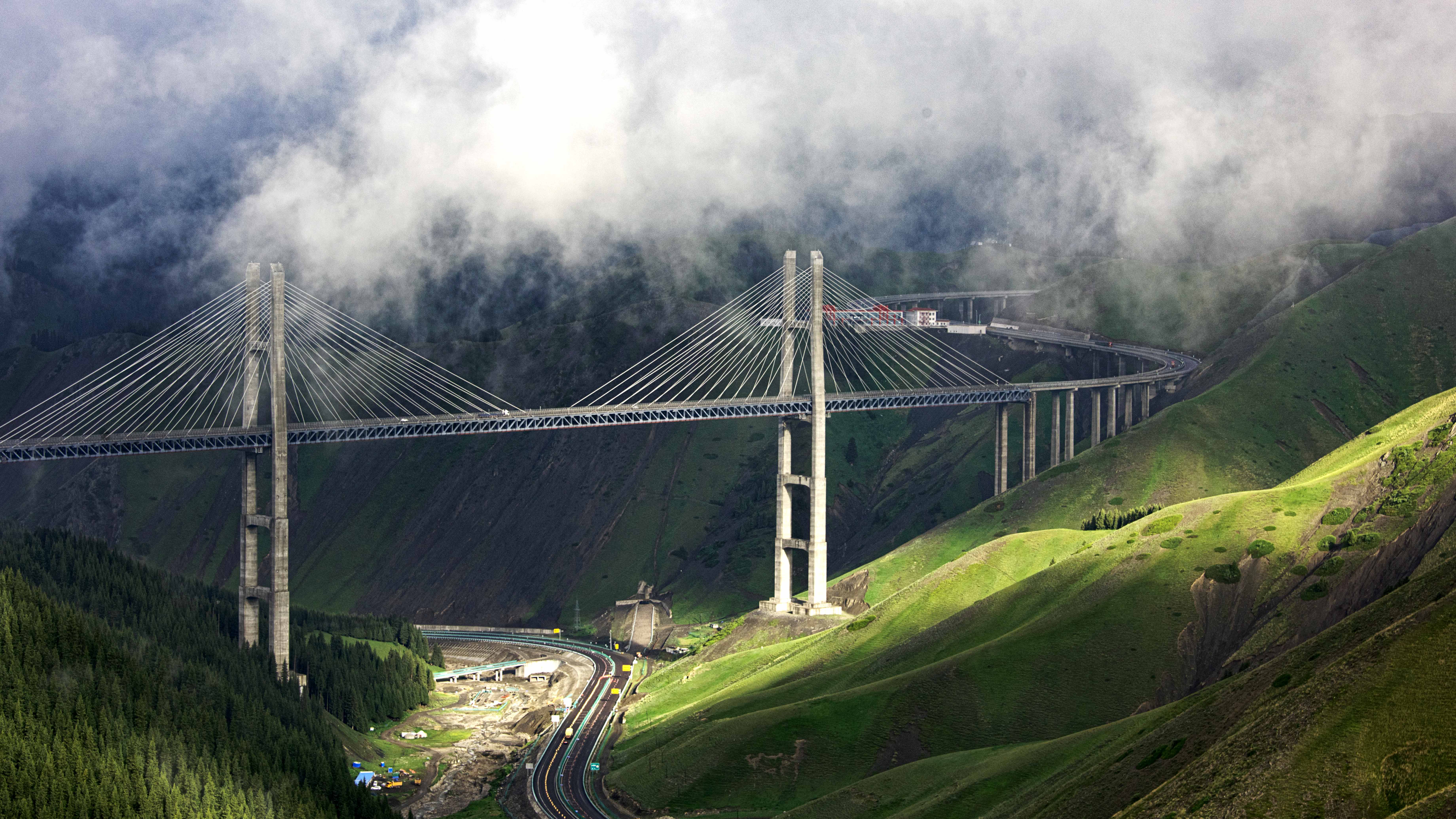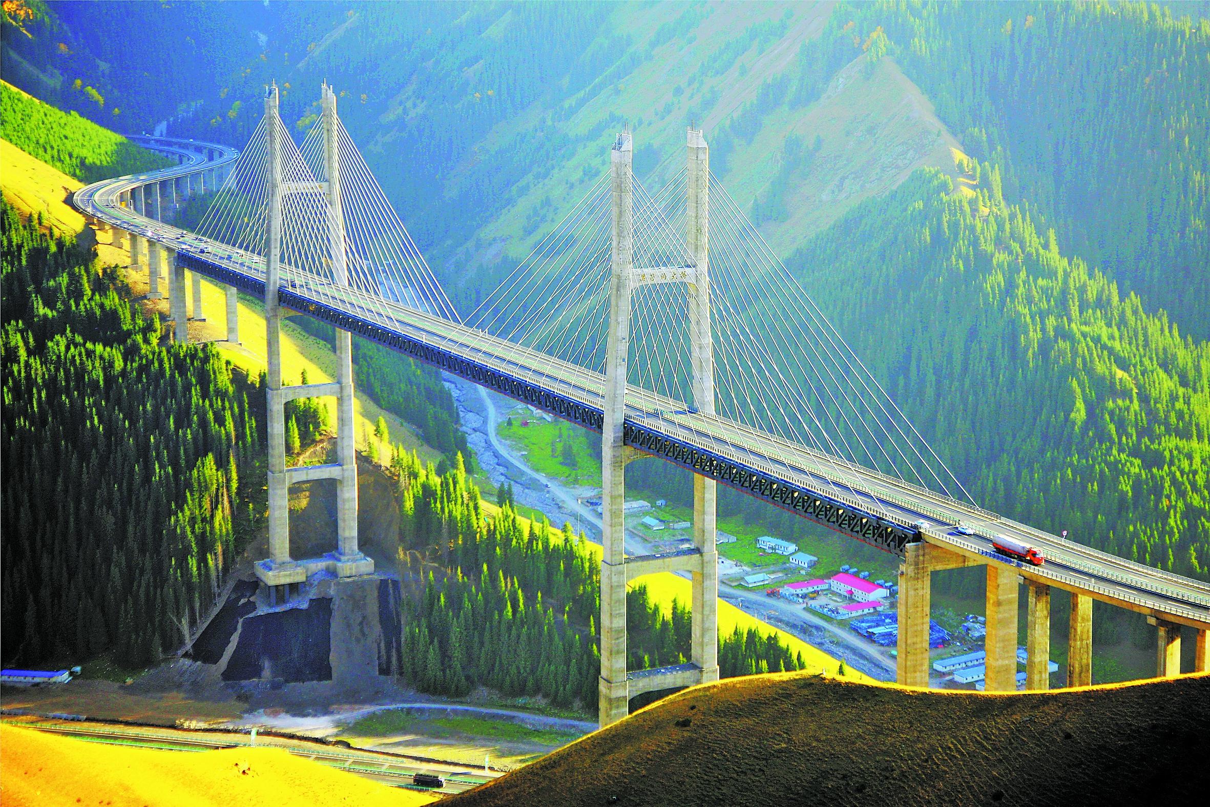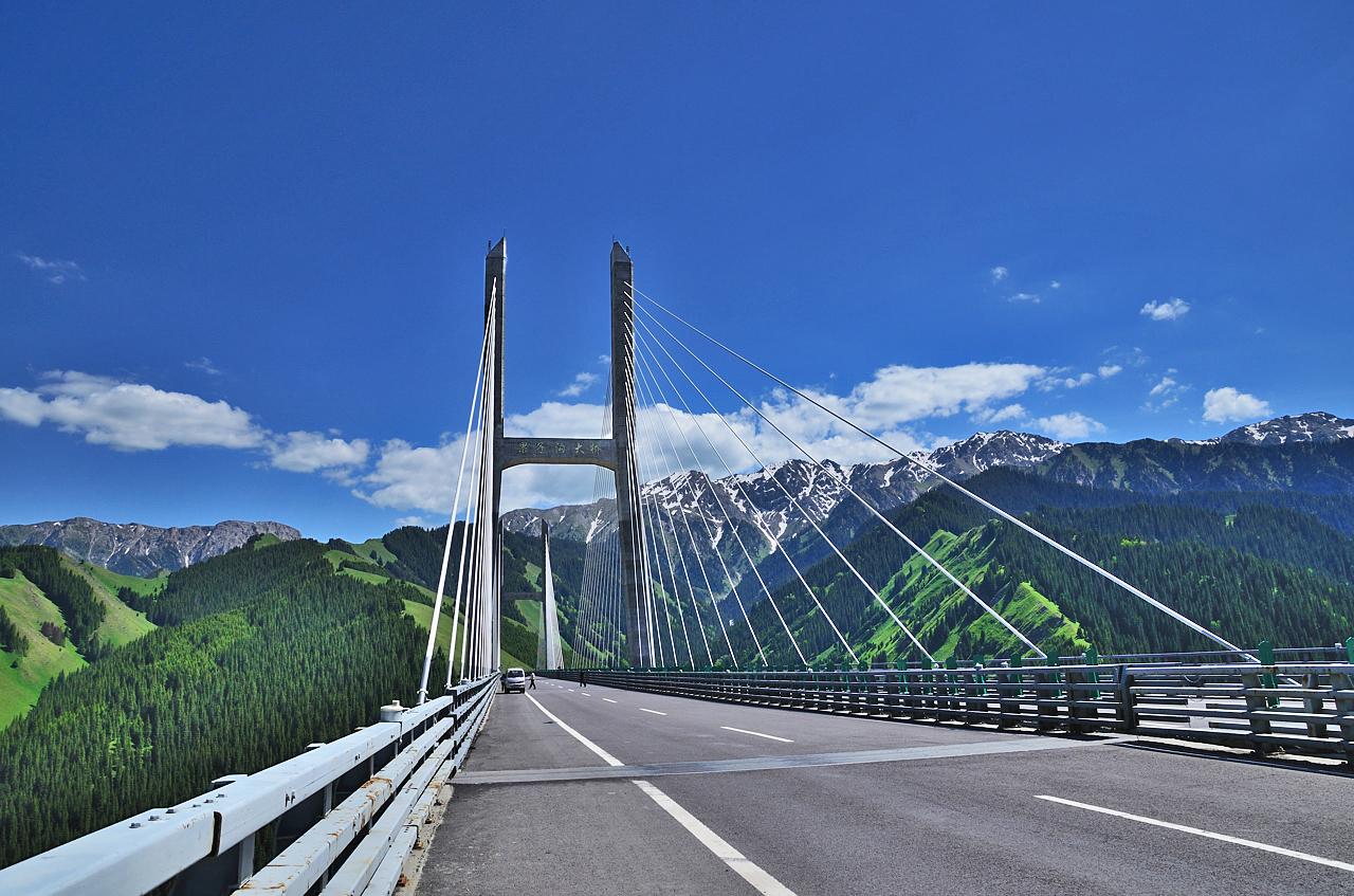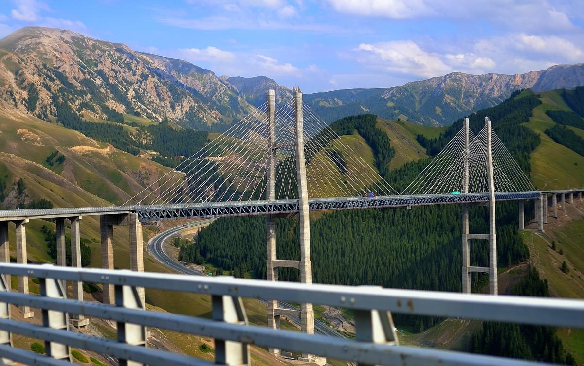 果子沟大桥作为全国首座公路钢桁梁斜拉桥、也是 新疆 第一高桥,是我国连霍高速公路的赛里木湖至果子沟高速公路控制性和标志性工程,它集新技术、新结构、新工艺、新设备于一身,是 新疆 公路建设史上一次重大突破。蓝天和白云之间,果子沟大桥显得那么高耸独立。它可是全部采用的钢结构,运用高强螺栓链接,整个桥面看上去十分霸气。