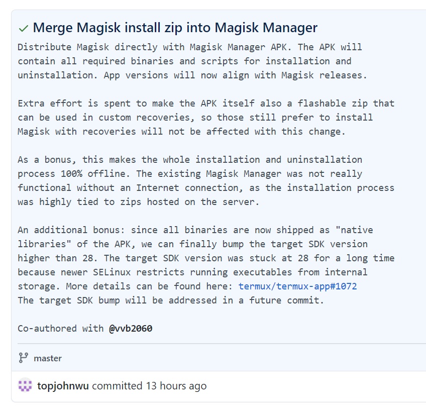 Magisk 的开发者表示,由于 Google Play 商店的限制,无法在该平台上提供含二进制 zip 文件的 App,因此用户需要自行在 GitHub 上下载。最新的安装步骤为:用户下载最新的 Magisk Manager apk 文件进行应用的安装,然后将 apk 文件的扩展名改为 . zip,进入 TWRP 环境刷入即可。这个文件既可以作为应用程序的安装包,也可以作为刷机 ZIP 文件。