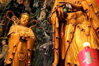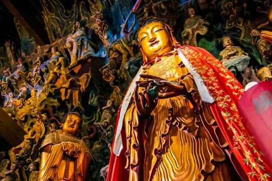 在大雄宝殿“三世佛”后方有一面高达13米的“海岛观音”壁塑,描绘的是“善财童子五十三参”的故事。我们先从整个壁塑的中心看起。