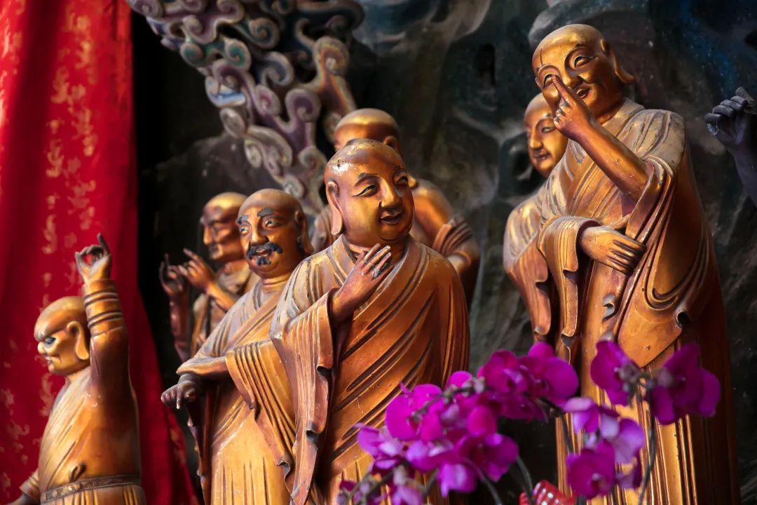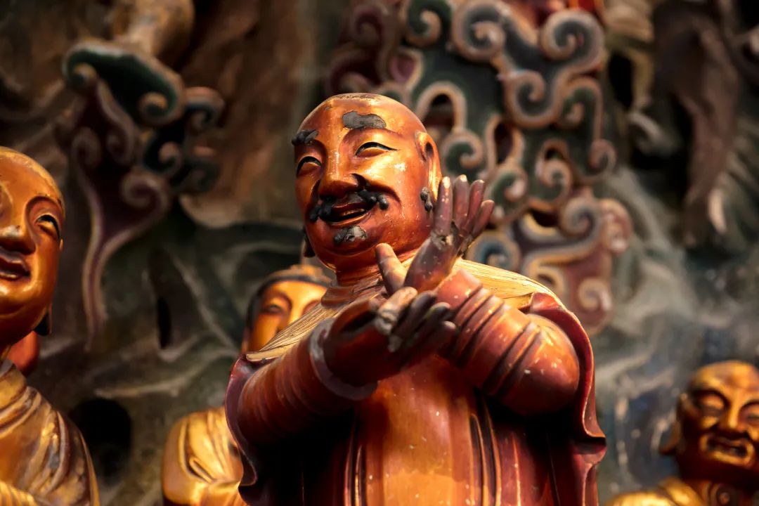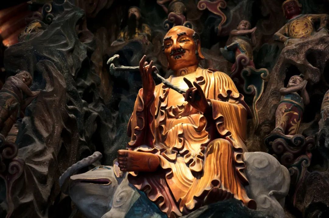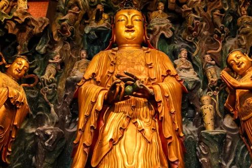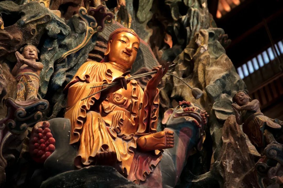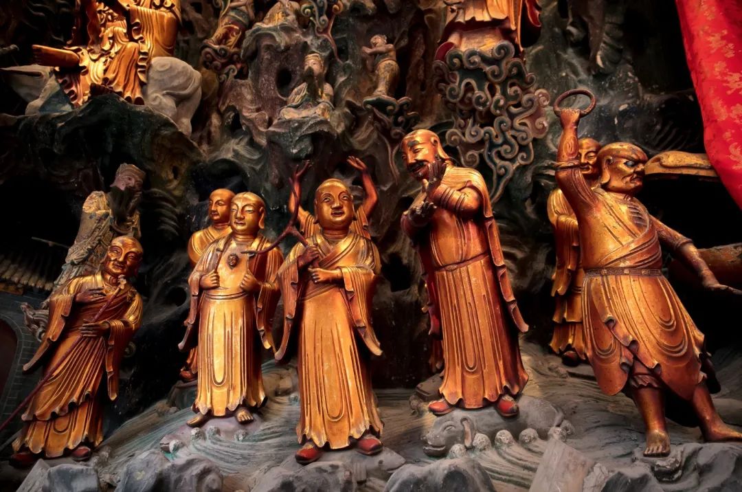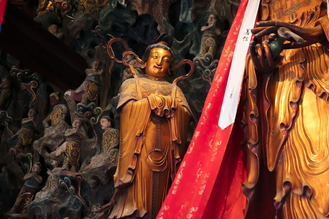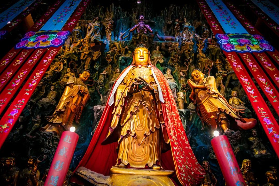 上期已经介绍了殿内的三世佛像,本期我们来看三世佛后的“海岛观音”,以及大殿两侧的“二十诸天”。