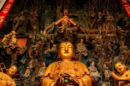 大雄宝殿多处于寺院建筑群的中轴线上,一般供奉有代表空间关系的横三世佛或代表时间关系的竖三世佛。