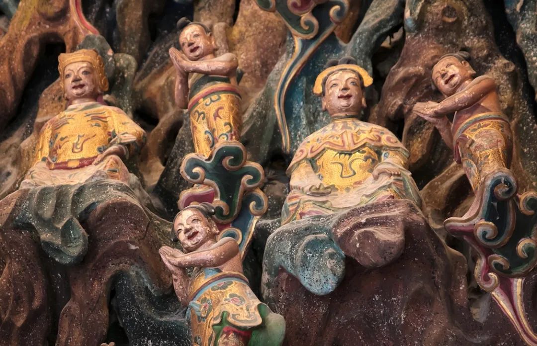 壁塑的中心是端立于鳌头之上的观世音菩萨,象征菩萨巡游苦海、救度受苦众生。其慈目低垂,手持净瓶,瓶口倾斜朝下,遍洒甘露。