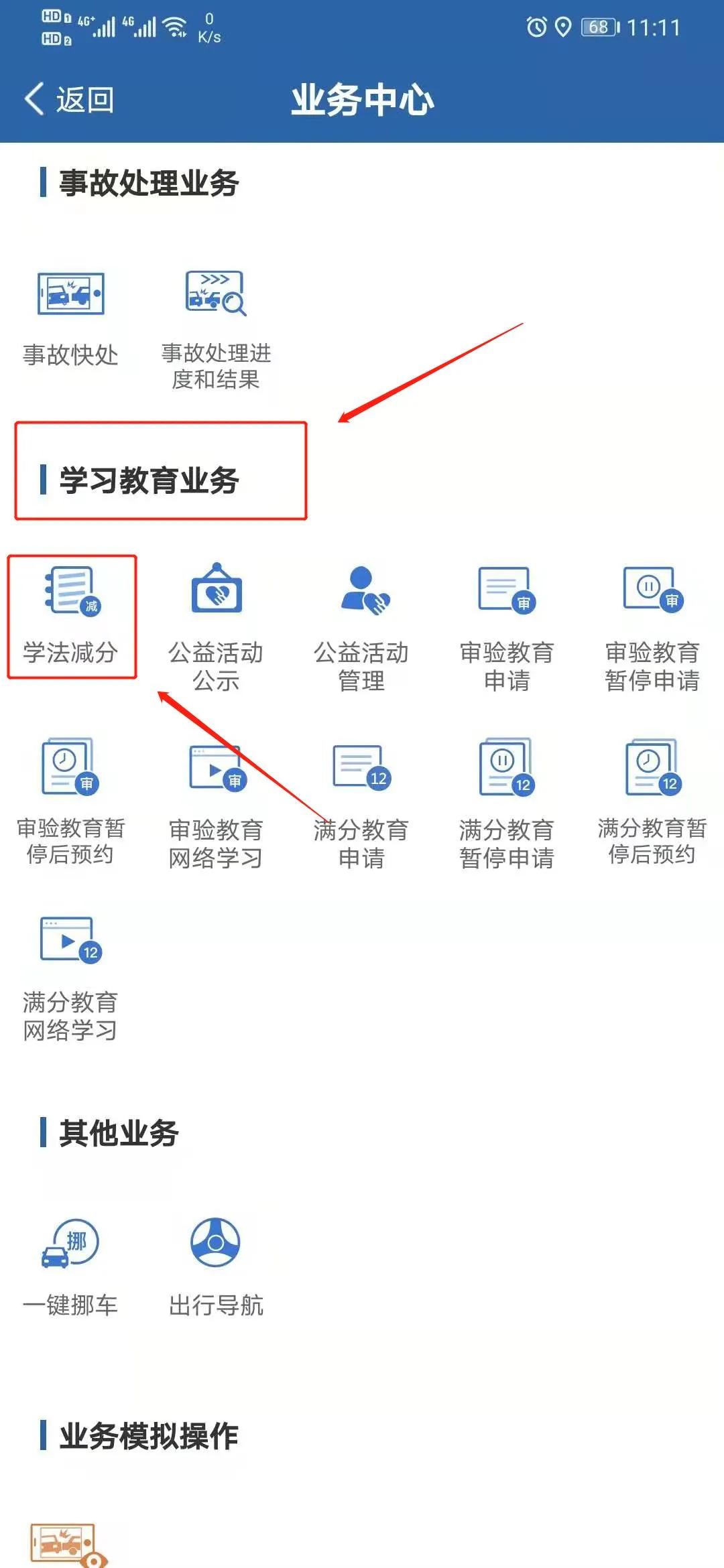 1、登录手机交管12123APP,点击【更多】进入【业务功能】界面,选择【学习教育业务】模块下->【学法减分】按钮,进入学法减分申请页面。