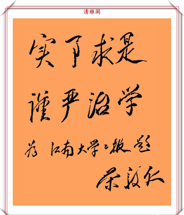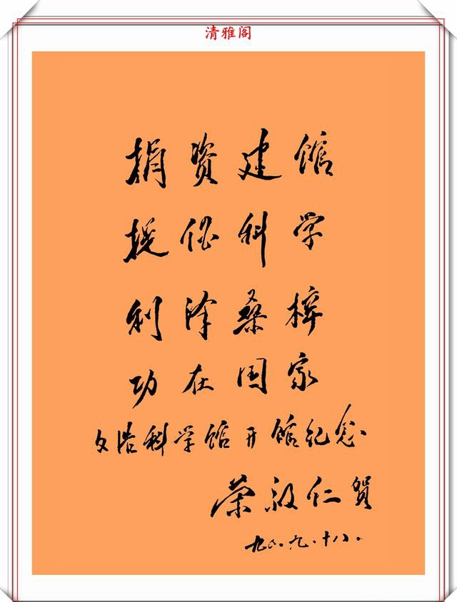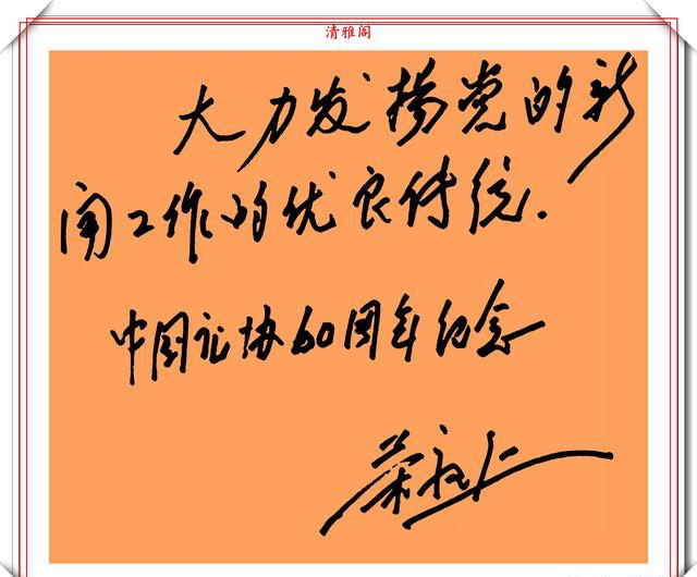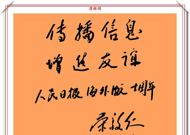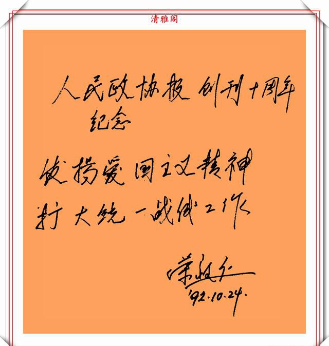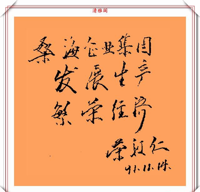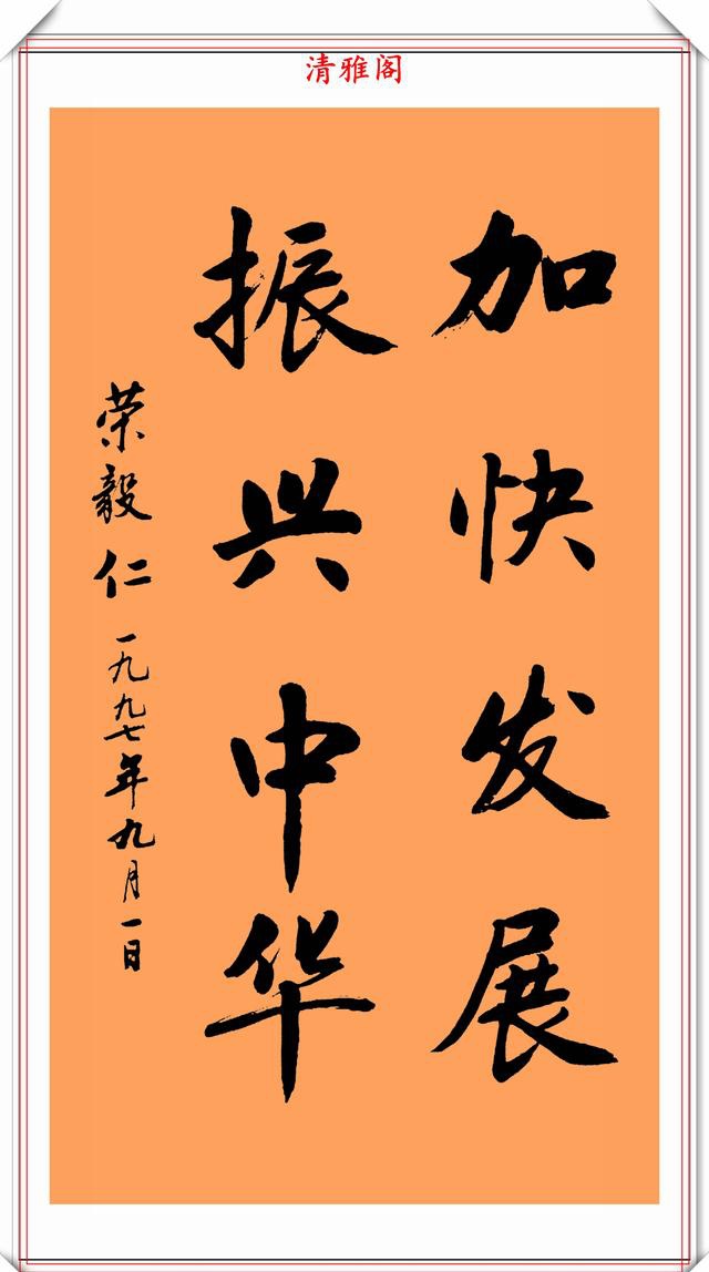 荣毅仁副主席的字细看给人的感觉是,这字还是蛮温馨舒适的,透着一股“稚气”,这股“稚气”就是书法的至臻至纯的个性表现。这种抛却笔法技巧的书写方式,往往能给一一种耳目一新的感觉,而且看上去也有很舒服的体验。他的字更是自成一体,不易模仿。一横一竖透出正气,一撇一捺透出坦荡。字写观察荣毅仁的字无不体现这端庄大气,雄壮有力的特点,这也恰恰反映出他宽广的胸怀。