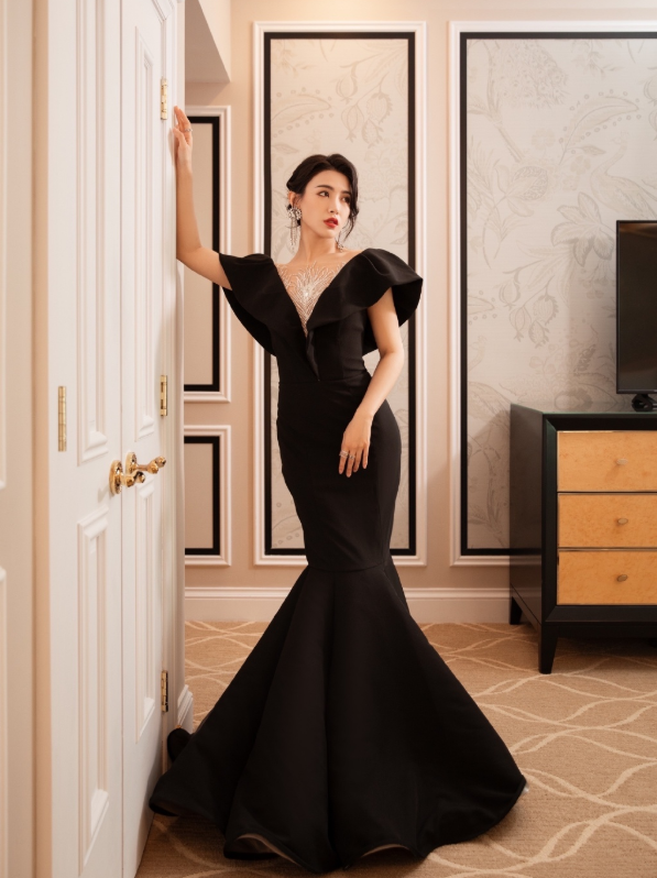戴萌这套黑色礼服既能够体现女性的曲线美,又展现了优雅的身段,V领设计很大胆,同时也藏着满满的细节小巧思,白纱刺绣拼接既显得更低调,也更显精致华美,性感中又带着女性的柔美和舒展。