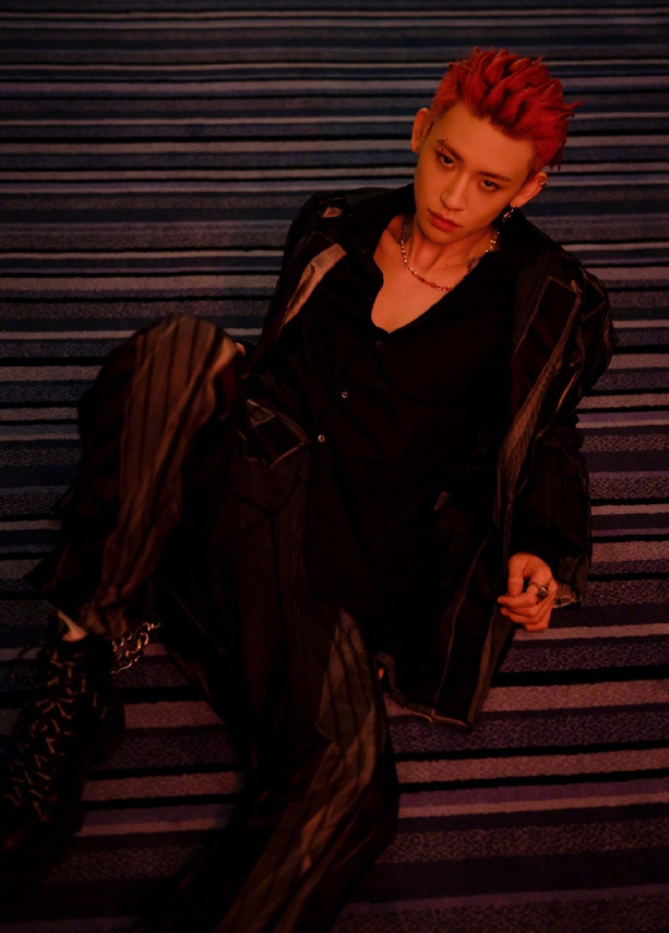 小鬼的黑色穿搭则把酷飒演绎到了极致,黑色外套搭配黑色衬衫,衬衫随意地散开即可扣子,显得野性又随性,搭配条纹长裤,气质又增加了狂野叛逆的一面,红色的冲天发型加上极具杀伤力的眼神,气质乖张到不行。