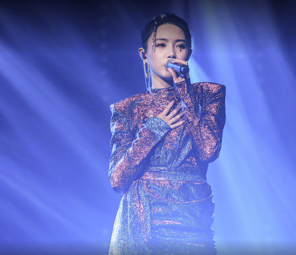 舞台上的一袭亮片连衣裙则一改前面端庄大气的一面,反而非常个性,修身设计衣服上的褶皱增加了慵懒率性感,搭配脏辫了眼睑下的泪滴,瞬间变得很张扬酷飒。