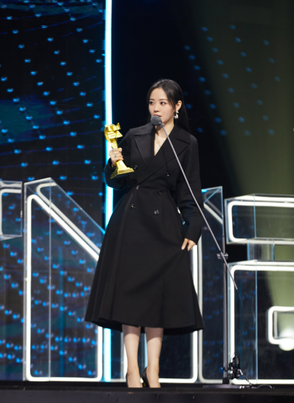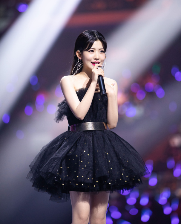 舞台上她选择了一身黑色的抹胸纱裙小礼服,穿在身上显得她非常娇小纤细,蓬蓬短裙十分俏丽可人,黑色腰带显瘦又显腿长,同时还显得整个人娇俏又甜美。