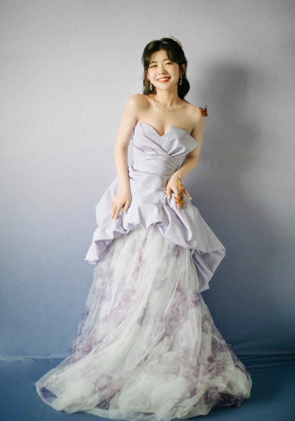 另外一套低胸礼服很有层次,上身是典雅大气的气质,下身的纱裙上面的紫色花朵让气质更加婉约柔美,搭配精致甜美的卷发,优雅又俏丽。
