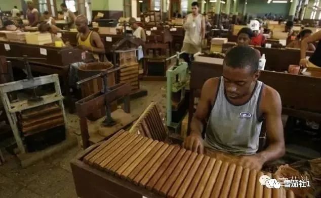 接待我们的梅盖尔是雪茄厂的中年技师,他在这家雪茄厂已工作了20多年,在厂里是公认的卷烟能手。我们随他来到一个小型的卷烟房,那里有六名师傅正在忙碌,他们每人身边放着三种烟叶,梅盖尔告诉我们,离工人手边最近的是作为主料的烟心烟叶,它置于雪茄的最里层;离工人手边最远的是雪茄最外层的卷纸烟叶;而放在中间的烟叶则是用于固定烟心的捆扎烟叶。