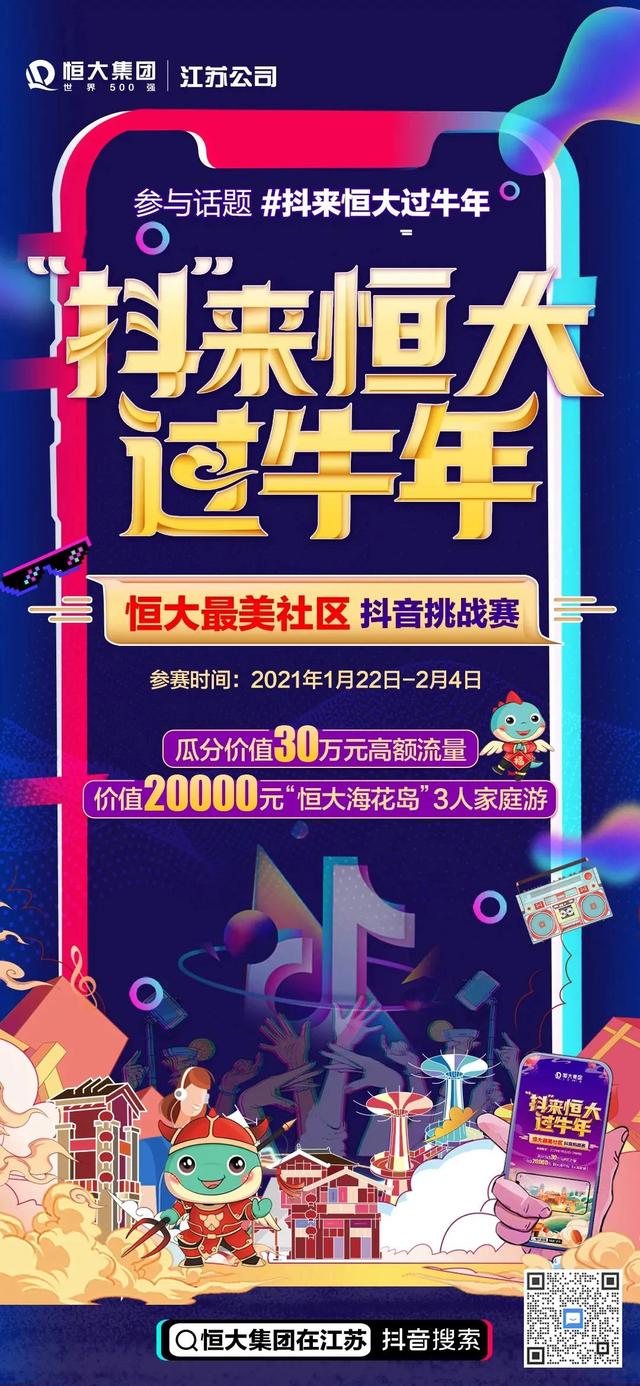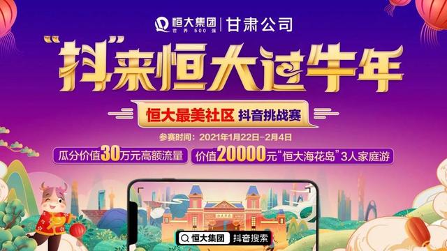 最美中国年,幸福在恒大。恒大最美社区抖音挑战赛即将火热开幕。“抖”来恒大过牛年,面向全社会征集抖音小视频作品,邀请你与我们一起加入其中。只要你爱生活,爱发现,有创意,有想法,那就不要再犹豫了,立刻参与比赛,多重好礼带回家!
