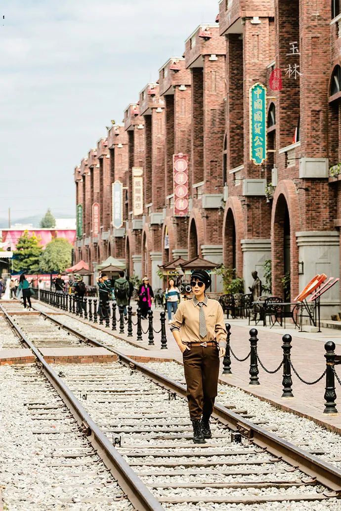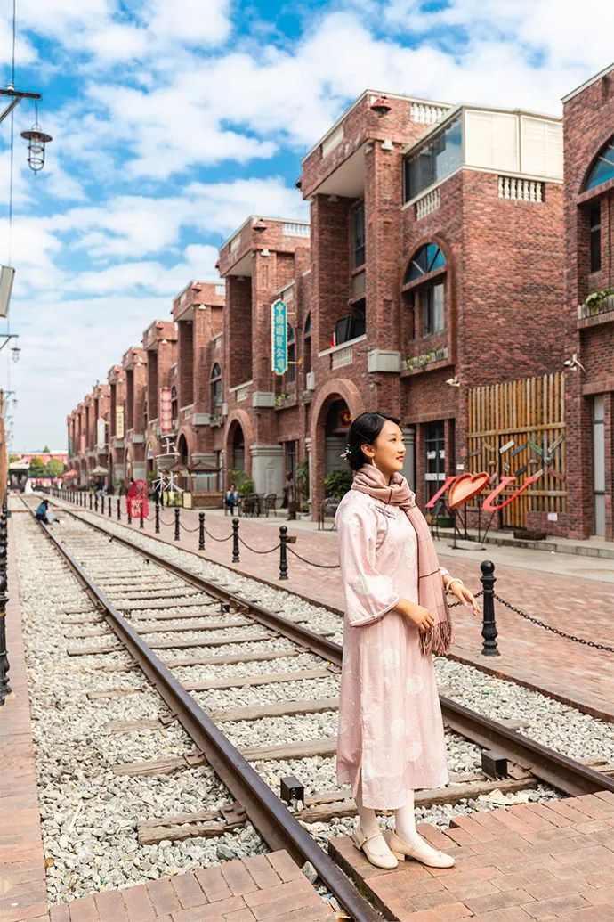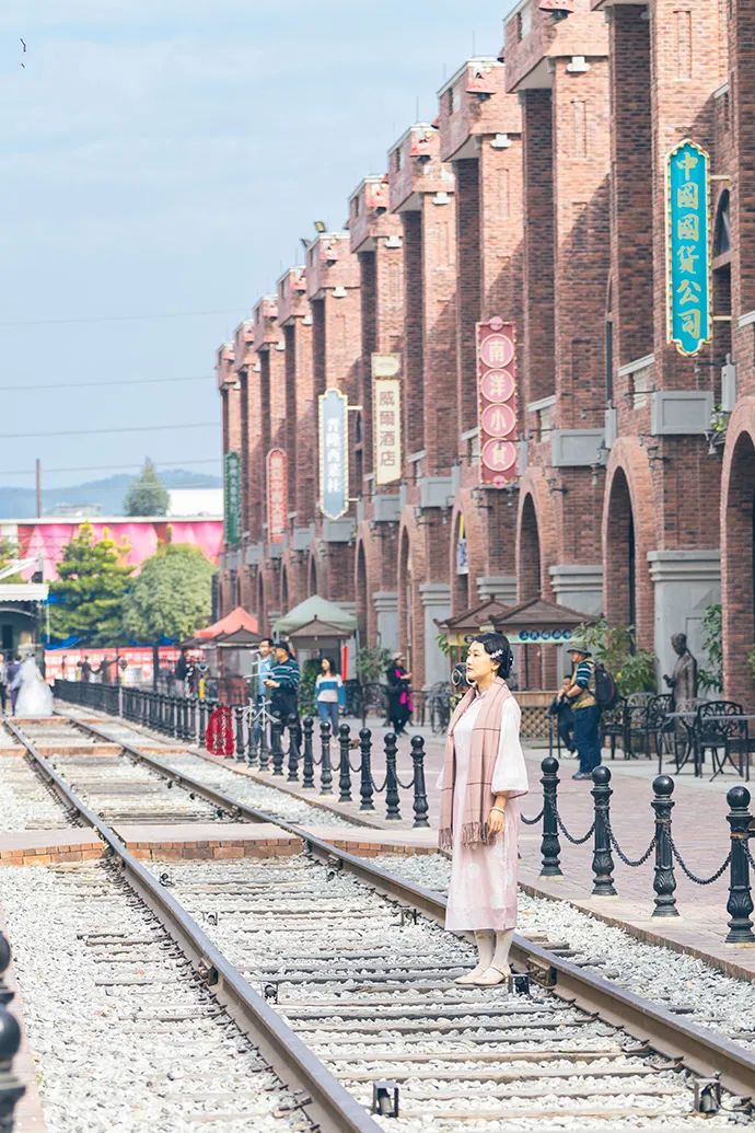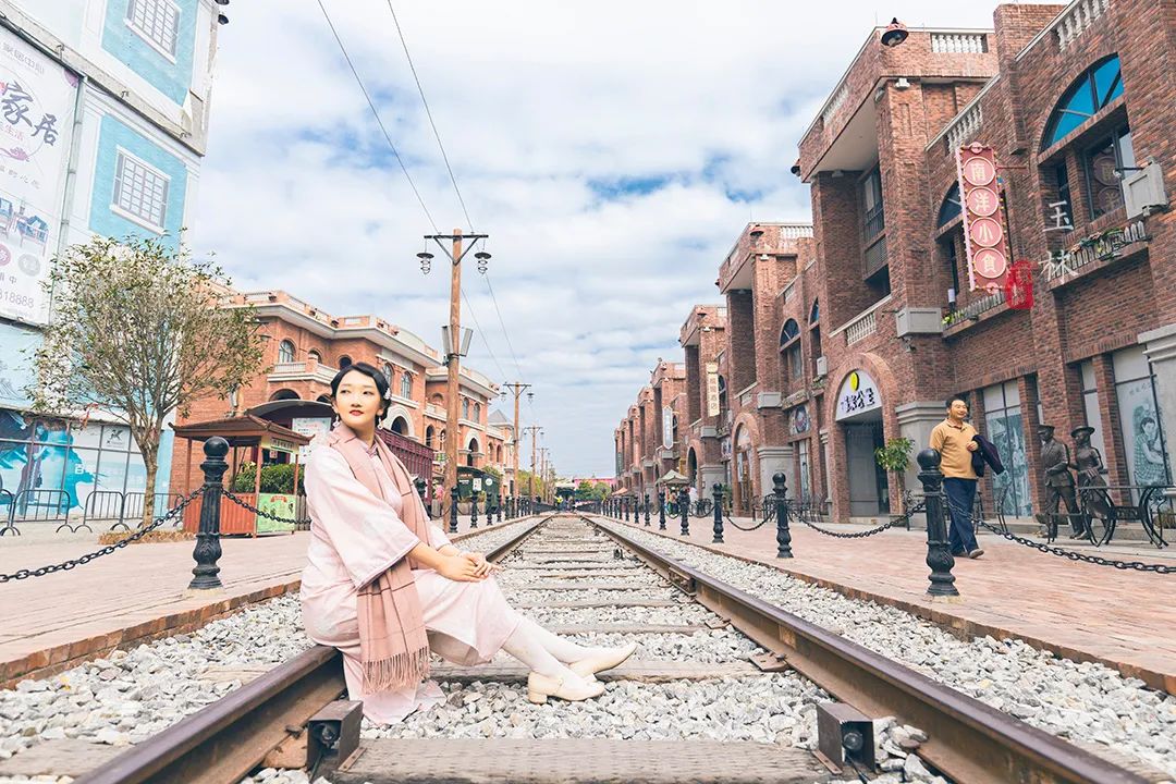 不得不说,民国小镇真的太适合拍照了。一袭旗袍,挽个发髻,端坐在铁轨之上,天空铺满了白色的云朵,延伸到视野尽头,两侧的建筑仿佛也随之无限蔓延下去。