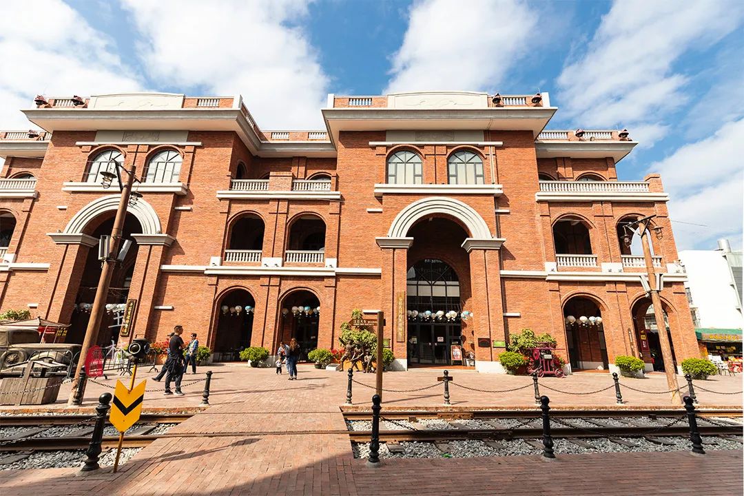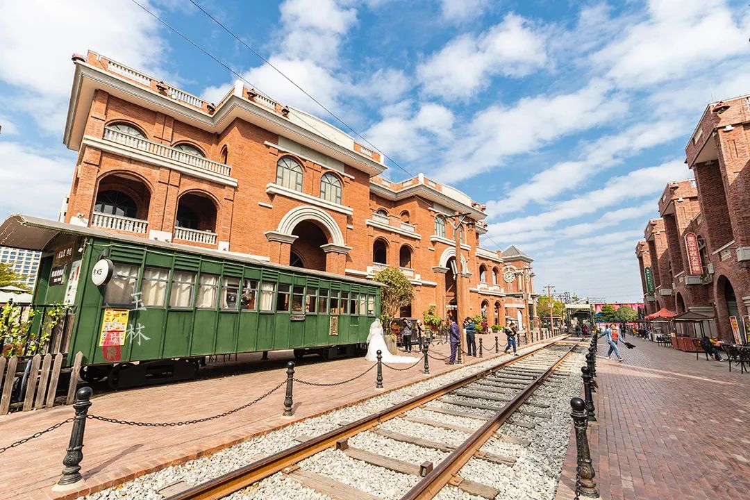 铁轨两侧,都是两三层楼高的民国建筑。砖红色外墙在碧蓝的天幕下显得格外大气,几点白色点缀,增加了一丝凝重。拱形的窗带着浓浓的欧式风情,将室外的阳光投射入室内。