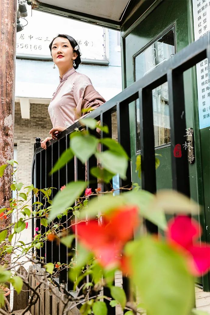 即使不拿建筑做背景,只是随意拍下一角,凭栏远眺、绿叶繁花,也是充满了民国风的代入感。