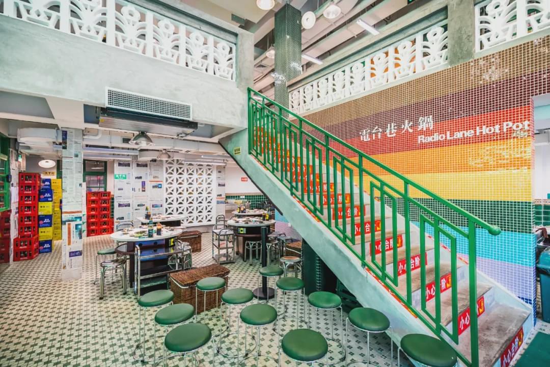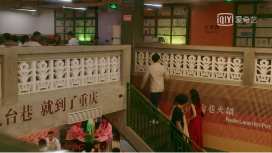 第一集中朱锁锁假扮表哥女友,去参加同学聚会的火锅店,画面中朱锁锁经过的这条彩虹楼梯墙,就让很多人一眼就认出来,是人民广场的电台火锅巷。
