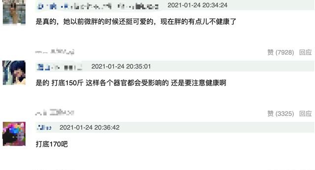 网友们纷纷在评论区里留言表示贾玲现在看起来最起码有170斤了,原来微胖的身材是可爱,现在已经胖得有点不太健康了,希望贾玲能控制一下体重,注意身体。