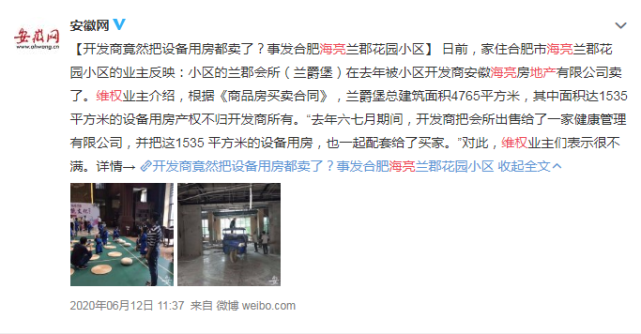 【开发商竟然把设备用房都卖了?事发合肥海亮兰郡花园小区】 日前,家住合肥市海亮兰郡花园小区的业主反映:小区的兰郡会所(兰爵堡)在去年被小区开发商安徽海亮房地产有限公司卖了。维权业主介绍,根据《商品房买卖合同》,兰爵堡总建筑面积4765平方米,其中面积达1535 平方米的设备用房产权不归开发商所有。“去年六七月期间,开发商把会所出售给了一家健康管理有限公司,并把这1535 平方米的设备用房,也一起配套给了买家。”对此,维权业主们表示很不满。