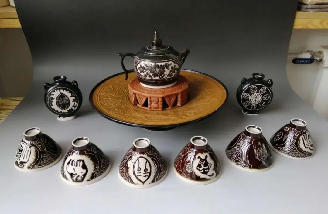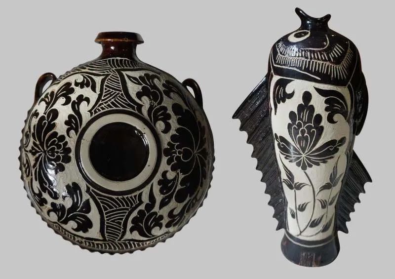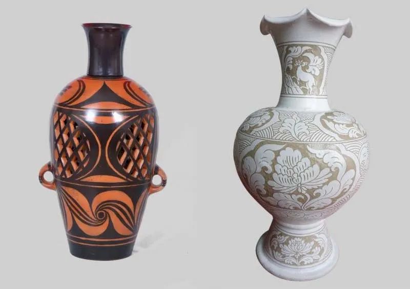 西夏制瓷工艺先进、造型考究、精美程度可媲美中原地区,其瓷器有白釉画花及黑、褐、绿、黄釉剔花等,色彩对比感极强。种类主要有翁、罐、瓶、碗、盘、碟钵、尊、盆、扁壶等,装饰多以花鸟、天鹅、鸭等禽类和花卉为主。其中,剔花瓷挂釉后,构画纹饰,剔刻去花纹以外的釉子露出白色胎底,黑白鲜明,构图新颖,线条流畅,刀法明快洗练,且讲究对称,布局严谨,形成了深浅色彩的强烈反差,增强了整体构图美感,具有极高的实用价值和艺术价值。