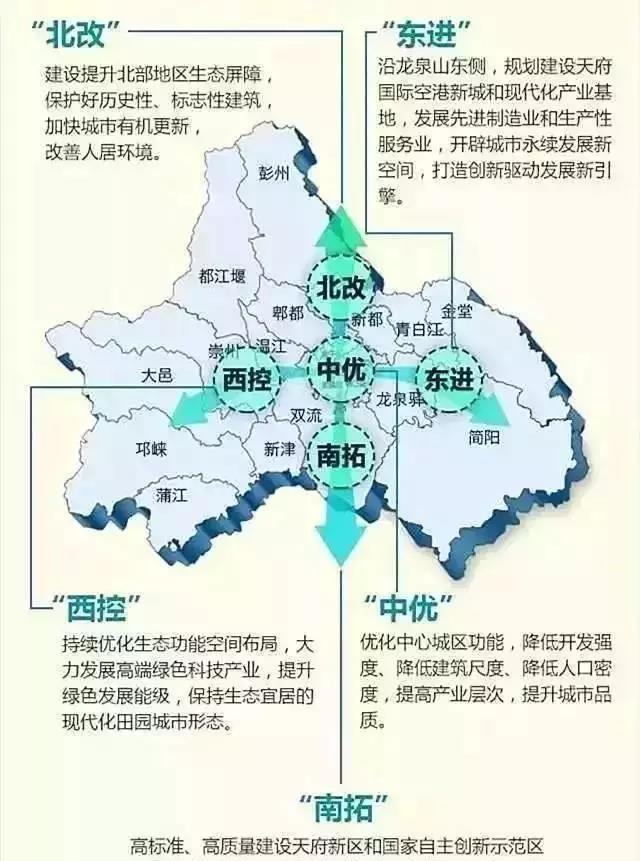 成都的未来是:“东进、南拓、西控、北改、中优”的十字方针。